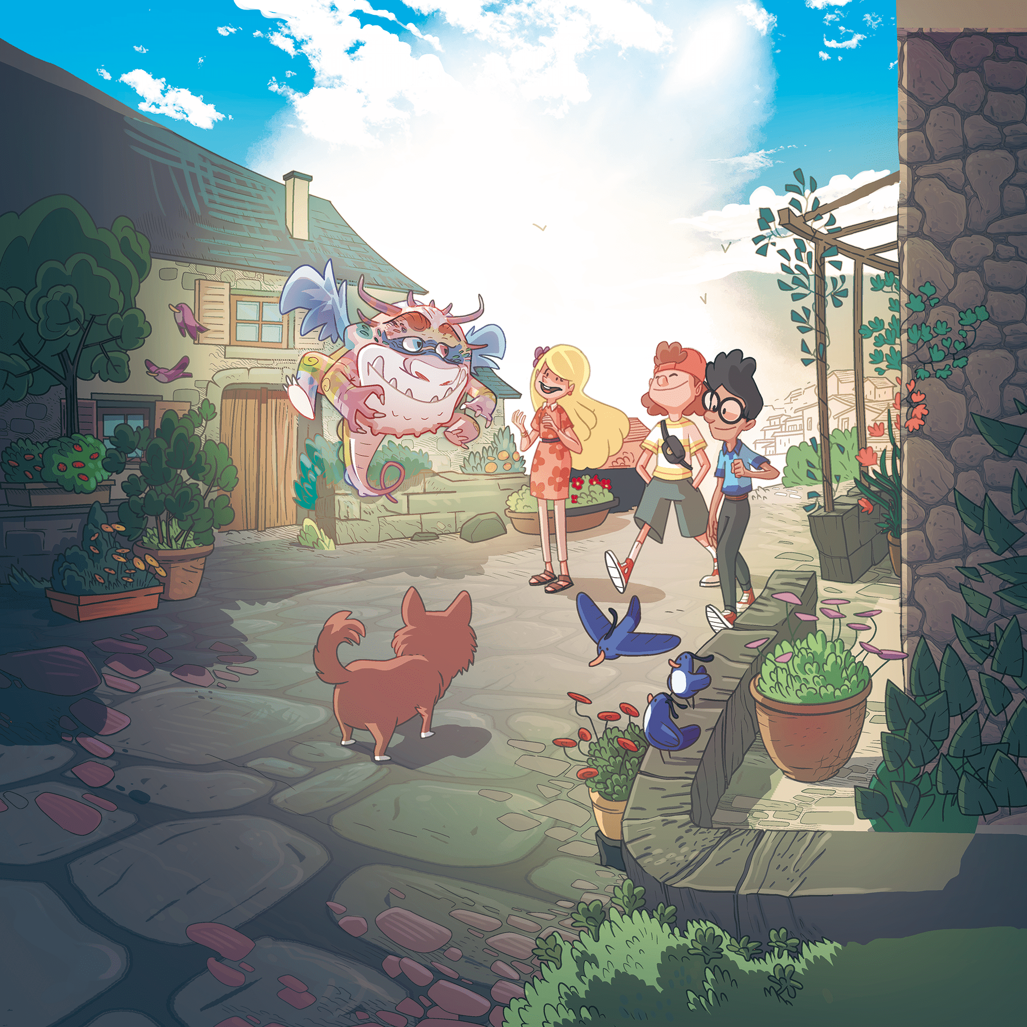 Les amis se dirigent vers l'écurie.